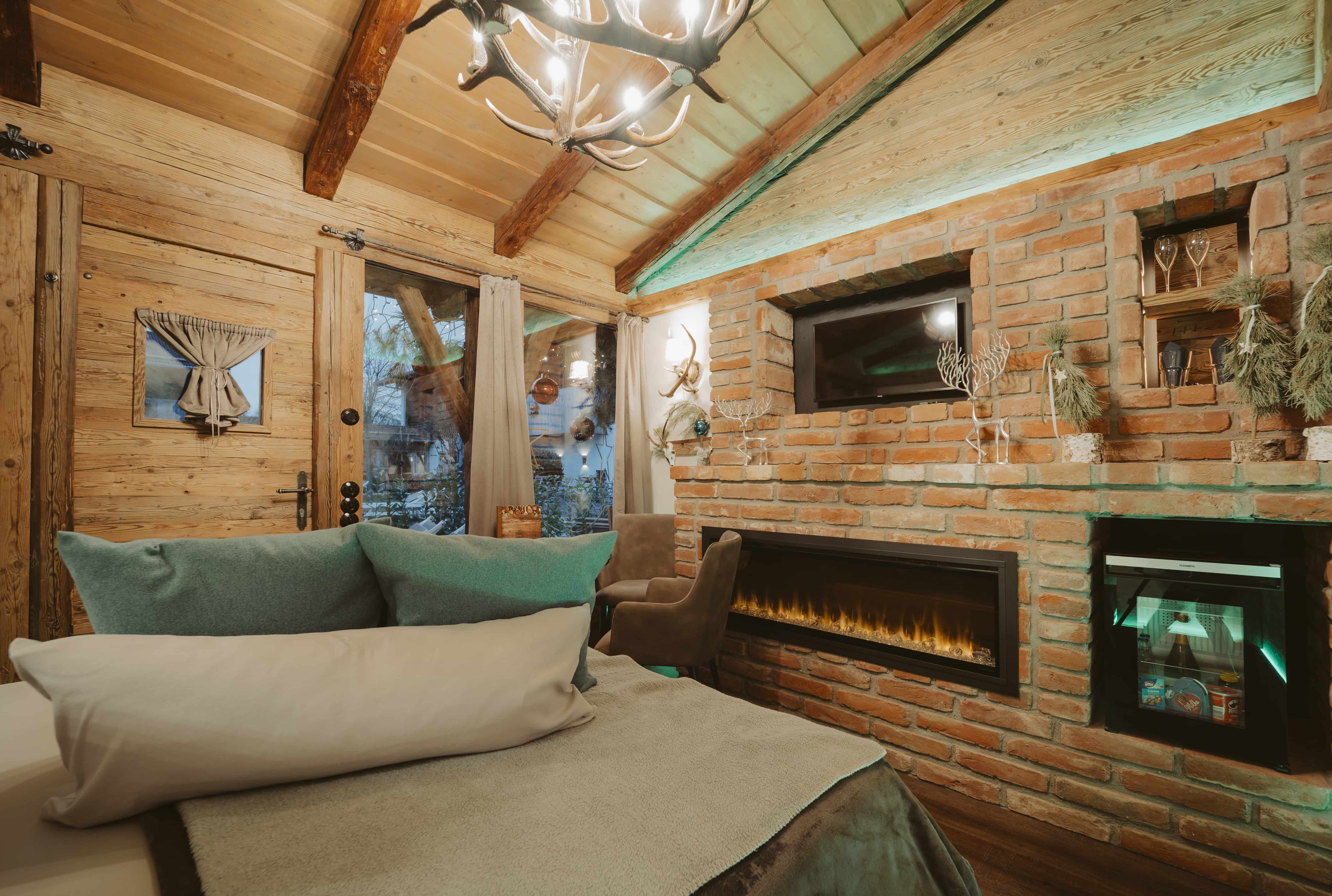 Dein privater Bereich für zwei Personen im Saunahof. 24m² private klimatisierte Lounge mit Queensize-Bett, Kamin, gefüllter Minibar, Tisch und Stühlen, privater Terrasse mit Liegen und Sonnenschirm.